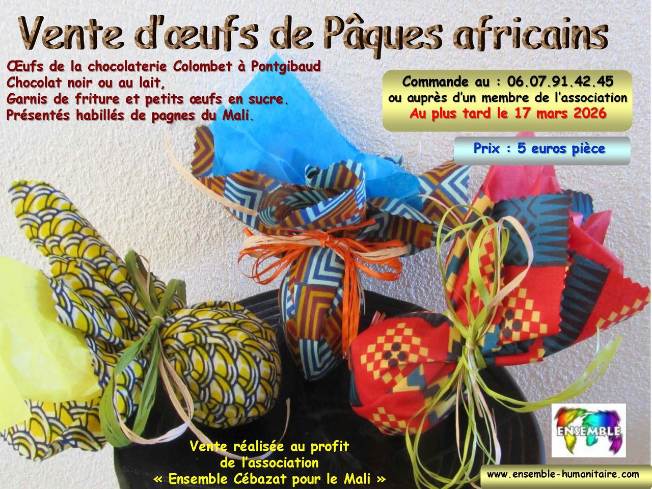 Afin de récolter des fonds, une vente d’œufs en chocolat, habillé de pagne africains par les membres de l'association sera organisée pour Pâques, au prix de 5 € l’unité.